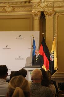 The evening opened with remarks by Rainer Robra, State Minister for Europe and the State Chancellery of Saxony-Anhalt, and Sven Schulze, Minister for Economic Affairs, Tourism, Agriculture and Forestry. Both speakers reflected not only on key political developments of the past decades but also shared personal experiences from the years following reunification. Their contributions offered an insightful retrospective on 35 years of the Federal Republic of Germany in unity and the many changes that have accompanied this period.